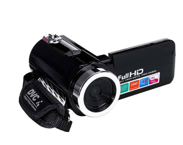 Features High quality Image  With 18X digital zoom and 24 MP you can enjoy image and video with high quality  and share your life with your family and friends in real time and FHD quality cameraNoise Canceling Microphones  External and built in microphones ensure nature stereo sound and crystal clear audio filter out background noiseMultifunctional Camcorder  5 0MP CMOS Sensor big storage media up to 32 GB captures high quality 24MP photos at speeds of up to 30 fps It s highly recommended to beginners and amateursMulti functional Features IR Night Version  Continuous shooting  Loop Recording  Face Detection  self timer  auto power off  TV output cable  32GB Notincluded   Specification Image  JPGImage Resolution  1M  5M  16M  24M24M 6000 4500   16M 4608 3472   5M 2592 1944   1M 1280 960 Video  AVIVideo Resolution  HD 1280X720   VGA 640X480 Sensor  CMOS sensor  Max 24 0pixelsOperating System  supports Windows7 2002 XP VistaStorage Media  Support TF Card  Max 32GBSensitivity  AutoLens  Fixed Lens  F 3 2  f 7 5mmFocus   Normal  1m infintyDisplay Screen  3 0 IN  16 9 270�rotatable TFT LCD displayerZoom  18X Digital ZoomFace Detect  SupportVidoe Sounds  SupportWhite Balance  Auto Sunlight Cloudy Lamp FluorescentSelf Timer  Off 2s 10sUSB Port  USB 2 0  compatible with USB2 0 1 0 TV Output  NTSC PALAuto Power Off  1min  3mins  5minsPower  18650mAh Li ion batterySize  126 x 60 5 x 61mm Package included 1 x DV Camcorder1 x AV Cable1 x Camera Bag1 x USB Cable1 x User Manual