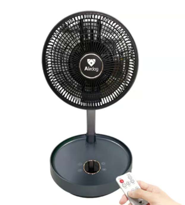 Airdog Battery Powered Folding Fan in Black As the newest innovation in air technology the Airdog Battery Powered Folding Fan is an exciting innovation for any space or occasion. From indoor use to outdoor camping or parties, Airdog has created a portable, space-saving design to keep you cool anywhere, anytime. Highlights • Oscelation and height adjustable Use as a table fan or a floor fan. • Foldable design allows for easy storage and transportation. • Battery powered and rechargable for on-the-go use anytime, anywhere! • Includes smart/auto mode and sleep mode + remote control. Specifications Unit Size (each) 14 cm x 9 cm x 5 cm Unit Weight (each) .5 lbs. Shipping Weight (each) 1 lb. Fan Speeds 12 Power 12V | Airdog Battery Powered Folding Fan in Black |
