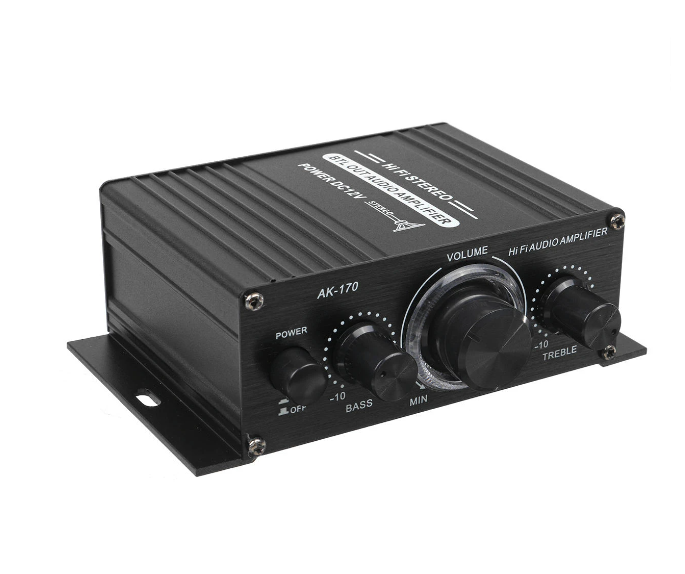AK170 Hifi 12V Car Amplifier Home Stereo Subwoofer Amplifier Sound Speaker LED Display Specifications Model AK170Color BlackMaterial Aluminum AlloySize about 125X75X40MMInput voltage DC 12VRMS power 20W 20WMax power 200W 200WChannel 2CHLoad impedance 4 16SNR 90 dbFrequency 20Hz 20KHzDistortion rate 0 01 Features Mini HIFI audio power amplifier Aluminum Alloy Body Large knobs are designed with blueLED lights tomake the products morebeautiful and beautiful Low distortion supplies a clearer stronger and more powerful sound Two main channel outputPackage Included 1 xAK170 AmplifierMore details |
