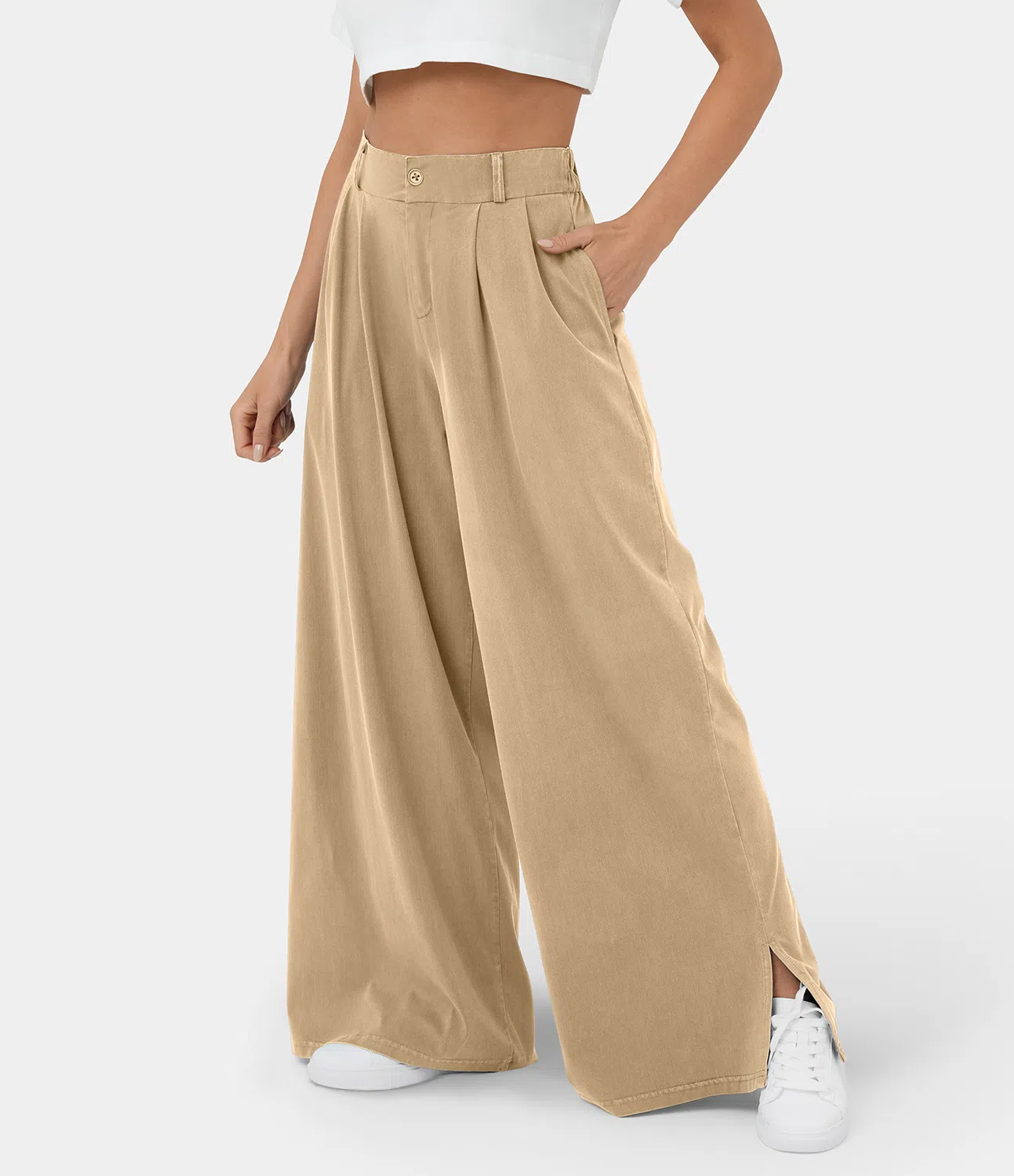 High Waisted Button Zipper Plicated Side Pocket Split Hem Wide Leg Casual Pants