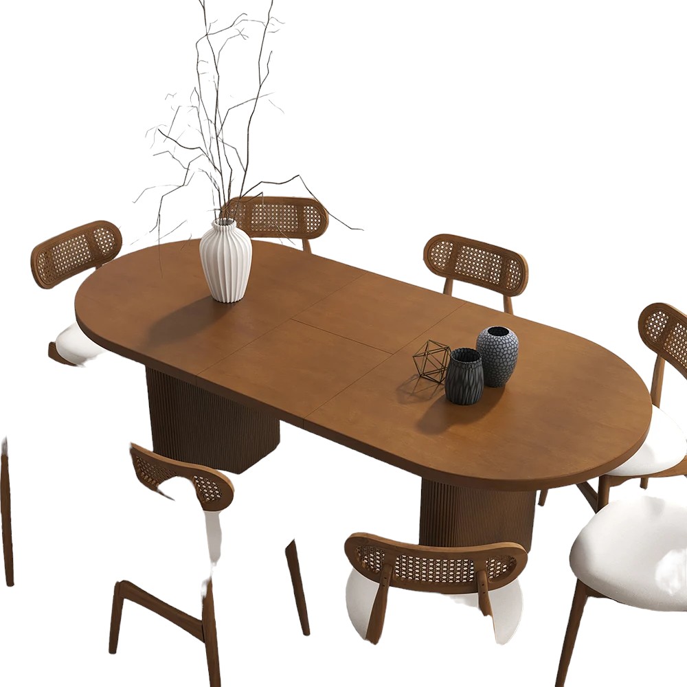 Japandi 63″-79″ Oval Extendable Dining Table with Butterfly Leaf 6 Seater Walnut Deck out your dining room in Japandi flair with this dining table. The smooth round corner design prevents scratches, especially safe for the elderly and children. Thanks to its expandable design, the tabletop of our dining table can be extended to accommodate up to 8 people. However, to ensure a comfortable dining experience with ample legroom, we recommend seating 6 individuals due to limited space underneath. To conveniently tuck chairs underneath the table, we suggest using armless chairs with a width of 16.9″. The double pedestal base will give years of service while the textured design livens up the design. A functional table designed and built by expert craftsmanship. |