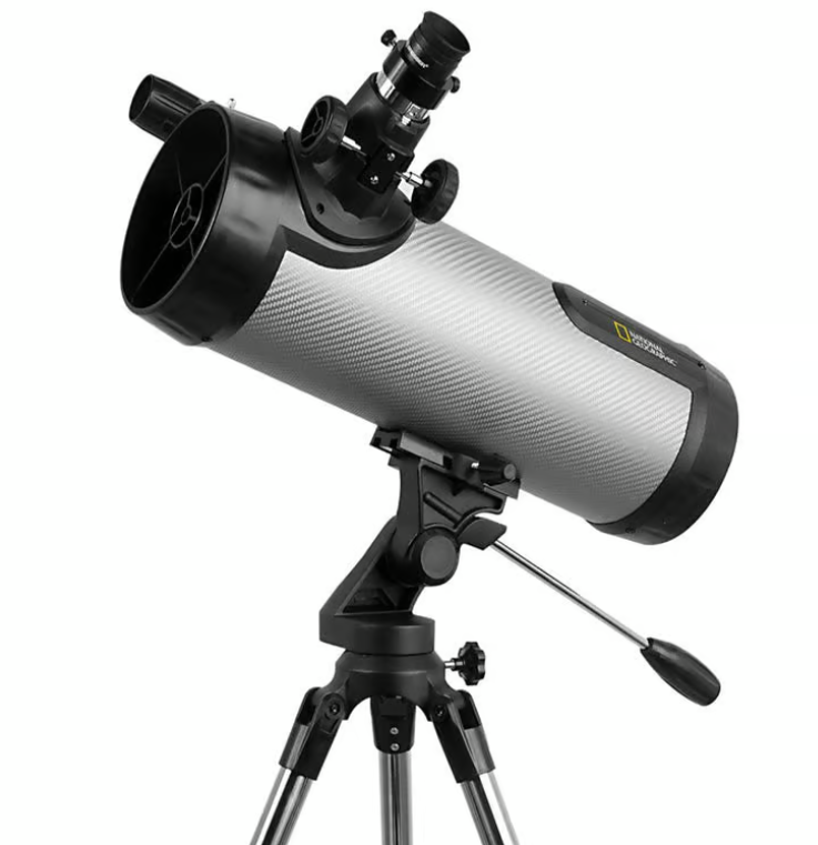 National Geographic NT114CF 114mm Reflector Telescope From our National Geographic series, the Explorer NT114CF Newtonian Astronomical Telescope is a perfect portal into the realm of deep sky observation. Offering a 114mm aperture and a 500mm focal length, the telescope comes with two Plossl eyepieces that produce images with excellent definition and contrast. The set also includes an adjustable tripod with pan and tilt control, a red dot viewfinder, a Smartphone Camera Adapter, Stellarium computer software download and a star map. Just add clear, dark skies on a moonless night and a red flashlight to protect your night vision and you are set to explore the universe! Features: 114mm aperture has impressive light-gathering capability to provide excellent views of planets and bright deep sky objects. Fast focal ratio (f/4.4) shortens exposure times for deep sky photography. Pan and tilt control on alt-azimuth mount allows for smooth movements when navigating the night sky. Comes with two interchangeable Plössl eyepieces and a 2x Barlow lens that provide magnifications ranging from 19x to 102x. Carbon fiber optical tube wrap assembly is lightweight but durable. Full size tripod includes accessory tray to keep eyepieces handy and provide additional stability. Included adapter helps observers use their smart device to capture and share images. Use the red dot viewfinder and downloadable astronomy software to locate observing targets. | National Geographic NT114CF 114mm Reflector Telescope |